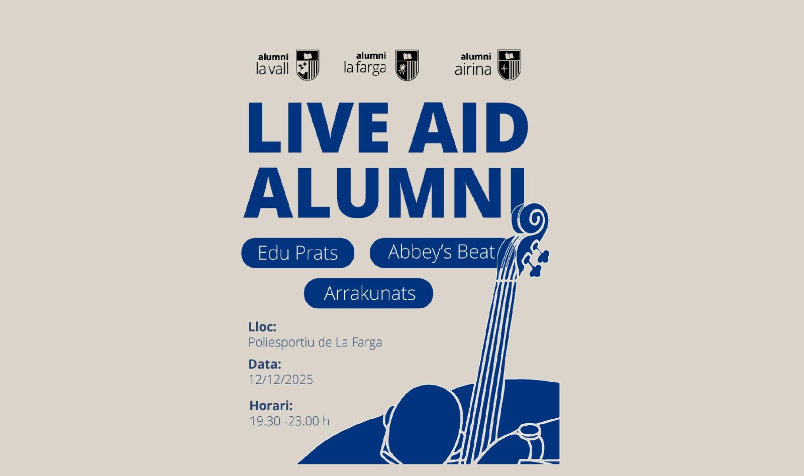 El viernes 12 de diciembre a partir de las 19:30 h, el polideportivo de La Farga se llenará de música, reencuentros y buen rollo con el I Encuentro Alumni de La Farga, La Vall y Airina…el LIVE AID ALUMNI